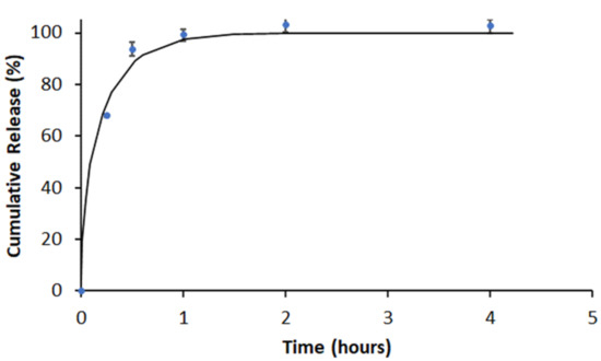 In vitro release experiments were carried out for the Flavopiridol loaded ILDF particles, utilizing the protocols described in Section 2.4 [14,35]. As shown in Figure 8 (blue dots), Flavopiridol was rapidly released from the 5.5 ± 1.3 m ILDF particles, reaching ~70% at 0.25 hrs and 99.4% at 1.3 hrs.
