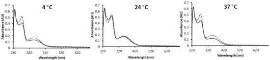 Left, Middle, and Right are the results of the stability tests of Flavopiridol in ILDF inhalable particles stored for up to 4 weeks at 4, 24, and 37, respectively. The UV-Vis spectra of the ILDF microparticles in 70% ethanol (solid black line) after 4 weeks of storage is displayed with that of the freshly produced ILDF microparticles (dashed black line). The absorption intensity was normalized using = 230 nm to allow for easy display and comparison.