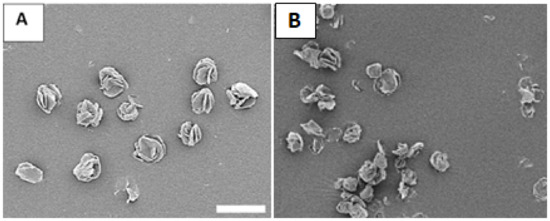 To test the physical stability and structural integrity of the produced ILDF particles, the particles subject to the harshest exposure conditions among the three, i.e., 40% RH, 24 C, and ambient laboratory conditions, were imaged using SEM. Figure 10 shows the results from freshly prepared microparticles in comparison to that after 6 months of exposure. The freshly produced ILDF particles seen in Figure 10A present a characteristic “Rose-bud” morphology with 4–5 outward folds per particle. These particles are well dispersed. After 24-weeks stored under ambient conditions, the ILDF particles still exhibited the characteristic “Rose-bud” morphology, as seen in Figure 10B. About 50% of particles became fractured, forming clumping or smaller particles.
