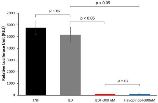 The biological activity of Flavopiridol in the ILDF particles was assessed using a luciferase assay [14,45]. The presence of TNF- in the luciferase assay causes the activation of luciferase expression, which is driven by the NF- promoter. In the presence of Flavopiridol, this activation is suppressed. As seen in Figure 11, The maximum luciferase activity was detected in cells treated with TNF only (black bar), as expected, because there was no inhibitor present. The blank ILD particles (Grey bar) showed similar behavior with no statistical difference because the luciferase expression continued uninterrupted without Flavopiridol.