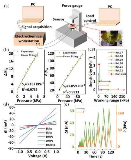 - Gao, L.; Wang, M.; Wang, W.; Xu, H.; Wang, Y.; Zhao, H.; Cao, K.; Xu, D.; Li, L. Highly Sensitive Pseudocapacitive Iontronic Pressure Sensor with Broad Sensing Range. Nanomicro. Lett. 2021, 13, 140. [Google Scholar] [CrossRef]