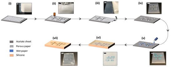 Fabrication workflow of the wet paper molding process. The mold fabrication only requires a cellulose paper sheet, an acetate sheet and a vinyl cutter. A sticky paper is laid on an acetate sheet (i) and a digital vinyl cutter is used to cut the mold shapes (ii). After carefully peeling off the background (iii), the dry molds are inspected for desired cutting operation (iv). Measured aliquots of water are pipetted on the molds and allowed to wet the paper through capillary action (v). Polymer mix is added on top (vi) and after curing, the chips is pulled from the mold (vii). The scale bars represent 1.5 cm for (i–iii) and 5 mm for (iv–vii).