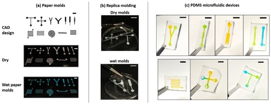 We utilized two different types of silicones in this investigation. One was a quick cure silicone that cured in 10–20 min at room temperature (Ecoflex 00-35 Fast Platinum Cure Silicone Rubber Compound Kit, Smooth-On Inc., Macungie, PA, USA). The second was polydimethylsiloxane, which was purchased from Ellsworth Adhesives (Sylgard 184 kit) and cured within 12–36 h at temperatures depending on the experimental parameters. After wetting the molds, the pre-polymer liquid was gently poured over them and incubated in a temperature-controlled oven. Once the polymer was cured, the acetate film along with the paper mold was peeled off from the silicone/PDMS chip. Notice that this step is inverse to existing solid molds, where the final PDMS chip is peeled off from the mold. Finally, to make an enclosed chip, featureless PDMS slabs were plasma bonded to the molded layer. Food colors dissolved in water were used for visualizing prototype microfluidic PDMS devices, as seen in Figure 3c.