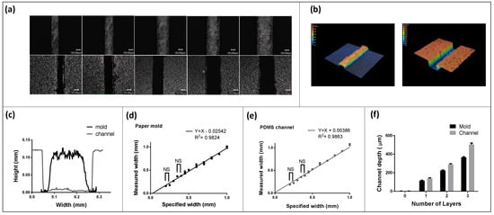 Characterization of liquid based micromolding process. (a) Several brightfield microscopic images showing the mold and the casted channel for different widths. The smallest channel width that could be replicated reliably was found to be ~175 microns. The scale bar represents 100 µm on each image. (b) 3D laser scan showing the paper mold and the corresponding molded microchannel in silicone. (c) Cross-sectional profile of the mold and the channel showing that the channel width is dependent on the amount of water added. (d) Plot showing measured width vs. specified width for the paper mold. A positive systemic error results from the cutting operation where the material is lost. (e) Plot showing measured width vs. specified width for the casted PDMS microfluidic channel. NS represent non-significant groups for which p > 0.05 whereas rest of the measurements were found statistically significant based on unpaired t-test and yielded a p < 0.001. (f) The channel depth can be controlled by stacking more paper layers.