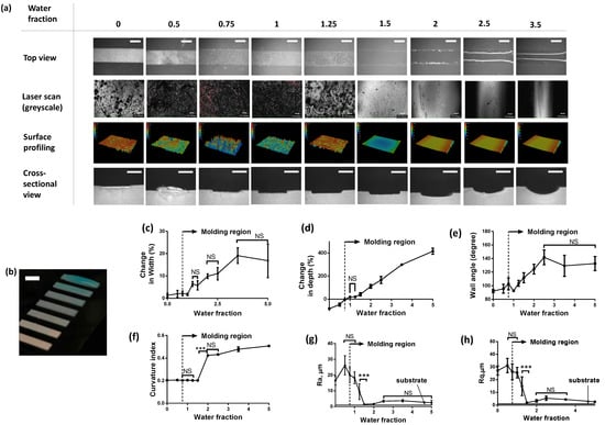 Effect of mold water content on the replica molding process. (a) Images and laser scans showing the effect of progressively increasing the water fraction of a mold. A minimum water fraction of 0.75 was needed to commence the molding process. The scale bars for top view and cross-sectional images are 1 mm. The scale bar for the laser scan grey scale images is 100 µm. (b) Image showing how the dry paper mold appears upon progressive addition of water. The scale bar on the image is equivalent to 2 mm. Even beyond the saturation point, the excess water is retained on the mold since the bottom substrate is hydrophobic. Characterization plots can be seen showing the effect of increasing water fraction on the channel width (c), on the channel depth (d), the wall angel (e) and curvature index (f). Additionally, the effect of water fraction on the resulting channel roughness was evaluated by measuring the gold standard roughness parameters, Ra and Rq as seen in (g) and (h). NS represent non-significant groups for which p > 0.05 whereas rest of the measurements were found statistically significant based on unpaired t-test and yielded a p < 0.001 denoted by ***.