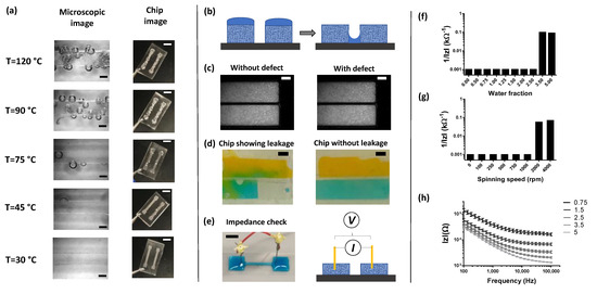 Effect of curing temperature and electrical impedance-based mold defect detection. (a) Several photos of PDMS chip cured at different temperature. It can be seen that at higher temperatures, the water from the mold evaporates, resulting in bubbling in the polymer solution. The scale bars represent 1 mm distance for microscope images and 5 mm for device photos. (b) Schematic showing a defect where the two channels which are separate get connected because of coalescence of water. Such defect is not visible as seen in (c) and can be seen in the fabrication chips after leakage test (d). Liquid molding offers a distinct advantage in detecting such defects by using impedance measurements (e) by using a two-electrode setup. A defect such as discontinuity can be detected by observing the jump in impedance profiles. (f) An example of a defect in the mold caused because of coalescence detected pre-molding process. (g) An example of a defect in the mold post molding operation caused by coalescence due to spinning the mold during the molding step. (h) Impedance-frequency spectra for various water fractions of the mold showing such curve can be used to create calibration plot for knowing the amount of water added in the mold. All the scale bars represent 1 mm distance for images in (c–e).