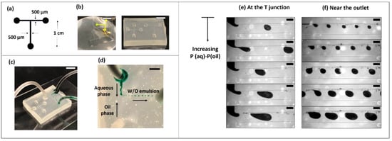 A water-in-oil emulsion generator microchip. (a) A CAD input file to the vinyl cutter showing the dimensions of the T junction. (b) The resulting silicone microfluidic chip from the wet paper mold. (c) Image showing the experimental set up where two fluids were flowed into the chip using gravity driven flow. (d) A zoomed-in view of the T junction showing the formation of water in mineral oil emulsions. Pressure difference between the two inlets was varied by changing the column height. Images showing microscopic view at the junction (d) and near at the outlet (e) can be seen where droplet sizes increase as a function of increasing pressure difference. For this demonstration, the column height of oil was maintained at the same level whereas the aqueous inlet column height was varied to modulate the pressure differential. The scale bars represent 5 mm for images in (b–d), while for all the images in (e,f), it is 250 µm.