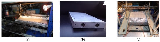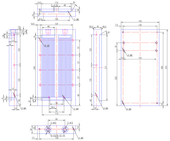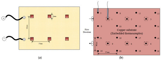 In order to improve the measurement accuracy for temperature, a piece of counterbore copper substrate with high thermal conductivity is set between the equivalent heat generator surface and heat sink surface to bury and grip thermocouples tightly, which looks similar to a sandwich structure, as shown in Figure 5. The thickness of the copper substrate is about 2.5 mm, which is slightly larger than the diameter of thermocouple wire. Furthermore, both sides of the copper substrate contacting the heat transfer surfaces are coated with heat-conducting silicone grease. All these settings are to reduce thermal resistance caused by gaps between surfaces during the thermocouple installation. A total of 22 copper–constantan thermocouples (T-type), numbered 1–22, respectively, are uniformly distributed in the substrate. See Figure 6b for details.