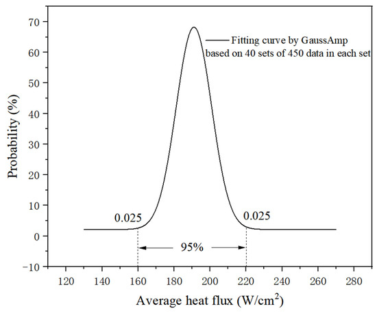 Pre experiments were conducted to determine the working time for each heating combinations. The worst situation taken as an experimental condition is that the heating surface is cooled naturally without water cooling, under the conditions of six hot spots working simultaneously with a total heating power of 900 W. In this case, it will take more than 7 s to exceed 80 °C, as the results show in Figure 7. Therefore, it is reasonable to let each heating combination work for 8 s during each switching. Probability statistics for average heating power density are conducted to test the random heating combinations program and actual performance based on 40 sets of 450 data in each set, in which each switching lasts 8 s for an hour running under a total power of 1200 W. The result shows that the confidence level is 95%, as shown in Figure 8, covering the average heat flux from 160 W/cm2 to 221 W/cm2. Therefore, it is effective to use the average heat flux for heating power density evaluation.