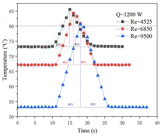 Experiments were carried out under instantaneous start-stop conditions with the typical heating power of 1200 W at various flow rates. Results are shown in Figure 9. It can be seen that the rates of three temperature rises are almost the same when water supply stops, but the cooling rate is obviously different under different flow rates when water supply is restored. The higher the flow rate the faster the cooling. To describe this difference, definition of RT1 and RT2 are applied to represent the respond time of instantaneous start-stop conditions. It can be seen that the RT1 segment is slightly shorter than the RT2 segment for all cases shown in Figure 9, which means the cooling rate is slower than the heating rate, although the flow rate restores the same as before stopping.