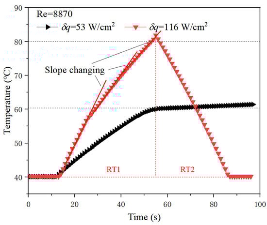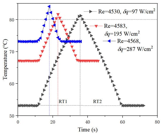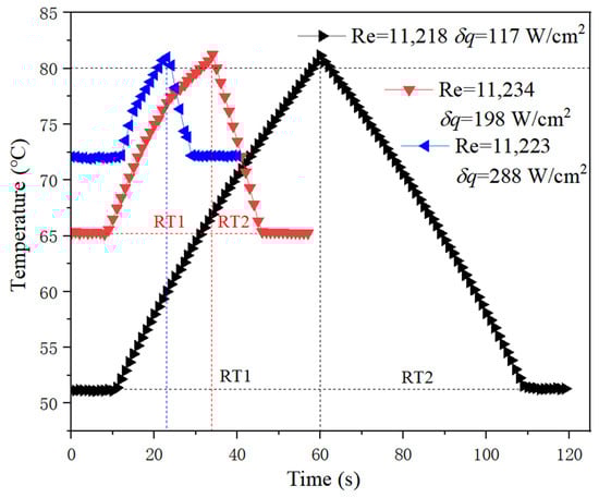 For all the cases that HT occurs as shown in Figure 11 and Figure 12, the greater the increased heat flux, the faster the temperature exceeds HT value. At a low flow rate, i.e., low Re in Figure 11, RT1 and RT2 are almost equal, which indicates that the heating rate and cooling rate are basically the same. However, they are different at a high flow rate. Generally, the cooling rate is higher than the heating rate, as shown in Figure 12, that is to say, RT1 > RT2. Moreover, it can be seen that the slope for the heating curve is changing during the heating process and is decreasing with time, as indicated in Figure 10 in detail, which can be seen in Figure 12, as well at high flow Re over 11,000. Analysis reveals that the local subcooled boiling of liquid is the cause of the above phenomenon. Although the bulk working medium is in liquid state, local subcooling is unavoidable under high heat flux. If bubbles produced by subcooled boiling can be taken away in time, heat transfer will be enhanced, otherwise, it will be prevented. Therefore, high flow rate can reduce the rate of temperature rise by taking away the bubbles easily, while the effect of low flow rate is not obvious. However, this does not seem true for conditions represented by the black curve in Figure 12, although there is a high flow rate. It can be predicted that the subcooled boiling will not occur when the heat flux increment is not high under high flow rate, which does not slow the heating rate. Overall, under current experimental conditions, no heat transfer deterioration occurs.