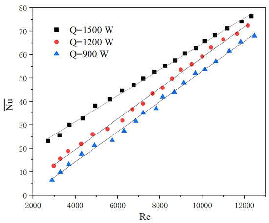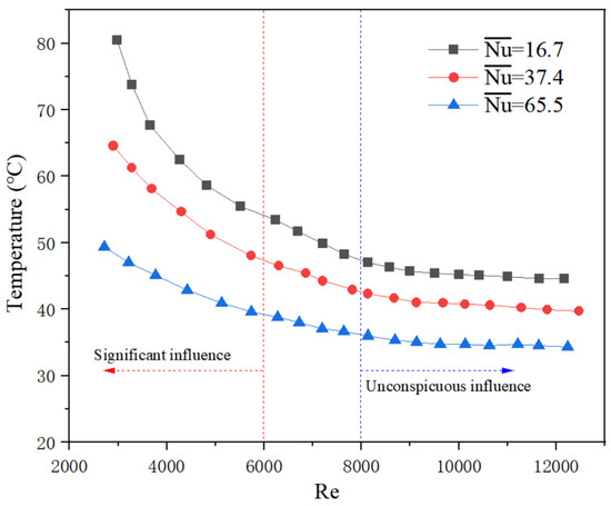 Generally, in practice when the flow fluctuates greatly, which is greater than 30%, the system will be shut down preferentially [2]. Since the situation of cutting off flow was discussed in Section 4.2, for the flow fluctuation, it is reasonable to take account of a fluctuation range of no more than 30%. Experimental results show that the average Nu varies with different Re, as shown in Figure 13, which is caused by different flow fluctuation, heating conditions, and physical properties. From Figure 14, it can be seen that the temperature rise rate increases significantly at a low flow rate (Re < 6000, as indicated on the left side of the red dash line). When the heat transfer intensity (represented by the average Nu number in the figure) is weak, a slight change in flow rate may result in a higher temperature rise at low Re. However, all the experiment data analysis indicates that the system with a stable state can be maintained at a range of safe temperature, which means this situation is not as dangerous as expected. At a high flow rate, the temperature rise rate is not obvious (Re > 8000, as indicated on the right side of the blue dash line).