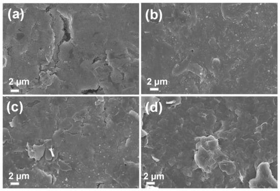 The morphology of the biosensors after stepwise modifications was characterized by field emission scanning electron microscopy (FE-SEM) as illustrated in Figure 1. The bare SPCE displayed a rough surface and an uneven morphology, whereas the surface of PB/SPCE was smoother with evenly distributed PB nanoparticles (Figure 1a,b). For P-rGO/PB/SPCE (Figure 1c), both PB nanoparticles and rGO nanosheet-like structures were observed. After GluOx–ASTENs immobilization, the surface became much smoother with aggregates (Figure 1d). These aggregates suggest good physical adsorption between the enzymes, AST-GluOx, and P-rGO nanosheets.