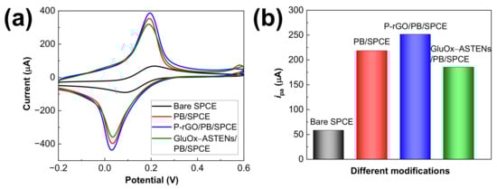 The electrochemical properties of various biosensors (i.e., bare SPCE, PB/SPCE, P-rGO/PB/SPCE, and GluOx-ASTENs/PB/SPCE) were evaluated by CV experiments. Figure 2a shows the cyclic voltammograms of the biosensors in 5 mM K3[Fe(CN)6] prepared in 0.1 M KCl at 50 mV s−1. All biosensors showed clear redox peaks. Except for bare SPCE, the other biosensors demonstrated much appreciable redox peaks due to the superior electron transfer characteristics of the PB, P-rGO, and GluOx-ASTENs modifications. Particularly, the P-rGO/PB/SPCE offered a higher redox peak current on the CV curve, indicating that this biosensor provided a high electrocatalytic activity toward the K3[Fe(CN)6] redox couple. Additionally, the anodic peak currents (ipa) of the biosensors were measured and plotted as shown in Figure 2b. The ipa values for bare SPCE, PB/SPCE, P-rGO/PB/SPCE, and GluOx-ASTENs/PB/SPCE were 58.1, 218.5, 251.6, and 185.4 µA, respectively. In comparison with bare SPCE, PB/SPCE, P-rGO/PB/SPCE, and GluOx-ASTENs/PB/SPCE showed increased ipa values, illustrating that the PB, P-rGO, and GluOx-ASTENs modifications improved the electroactive surface area of the biosensor. Especially, P-rGO/PB/SPCE demonstrated a maximum ipa value. In comparison to P-rGO/PB/SPCE, the GluOx-ASTENs/PB/SPCE exhibited a mild decrease in its ipa value, which was due to the immobilization of hydrophobic or negatively charged enzyme molecules that partially repelled the negatively charged K3[Fe(CN)6] redox probe toward the biosensors [20].