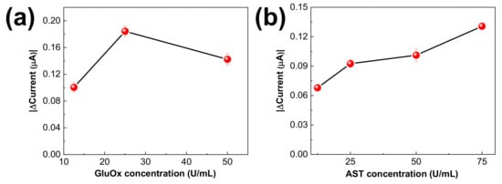 The GluOx-ASTENs/PB/SPCE biosensors were optimized using both GluOx and AST enzyme loadings. Enzyme molecules apparently slow down the electron transfer, reducing the sensitivity of the biosensors. Therefore, optimizing the GluOx and AST loadings onto the P-rGO nanosheets using various concentrations of GluOx (i.e., 12.5, 25.0, and 50.0 U/mL) and AST (i.e., 12.5, 25.0, 50.0, and 75.0 U/mL) to prepare the GluOx-ASTENs were followed. The amperometric current responses increased as the GluOx concentration increased from 12.5 to 25.0 U/mL (Figure 3a). The higher GluOx loading concentration (i.e., 50.0 U/mL) demonstrated a slight decline in current responses. Therefore, 25.0 U/mL was chosen because of its improved current response or bioactivity. Likewise, as shown in Figure 3b, various loading concentrations of AST (i.e., 12.5, 25.0, 50.0, and 75.0 U/mL) were optimized in which 75.0 U/mL demonstrated increased bioactivity. Finally, 25.0 U/mL loadings of GluOx and ~75.0 U/mL AST loadings were chosen as the optimum compositions.