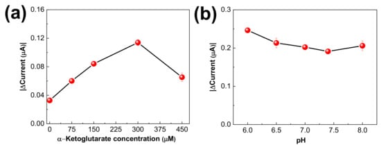 Figure 4. (a) Current changes against 0.8 mM Asp using GluOx–ASTENs/PB/SPCE fabricated using 25 U/mL GluOx and 62.5 U/mL AST in the presence of different concentrations of α-ketoglutarate (i.e., 0.0, 75.0, 150 and 300 µM) in the buffer. (b) Current changes across varied pH solutions on GluOx–ASTENs/PB/SPCE in 0.8 mM Asp in buffer at the applied potential of −0.1 V.