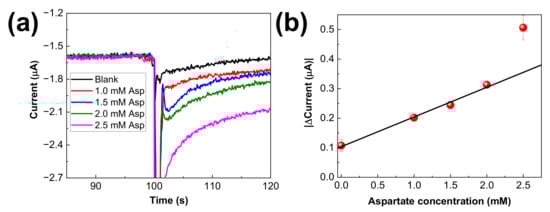CA measurements were performed for varied concentrations of Asp (i.e., 0.0, 1.0, 1.5, 2.0, and 2.5 mM) using GluOx-ASTENs/PB/SPCE under optimized conditions. As shown in Figure 5a, the current responses were stable and proportional to the added Asp concentration. The current responses after 20 s of Asp additions were measured and the calibration curve was plotted. (Figure 5b). The plotted results are the mean values of four measurements, with error bars signifying their standard deviation. The linear range was estimated to be 0–2.0 mM, and the regression equation was i (µA) = 0.1005 CAsp (mM)–0.104 (R2 = 0.991) and a sensitivity of 0.8 µA mM−1 cm−2. The limit of detection (LOD) was 500 µM (S/N = 3). The characteristics of the biosensor were compared with the reported amperometric and potentiometric Asp biosensors summarized in Table 2. In comparison with other biosensors, the sensitivity of our biosensor was high. Yet for real sample applications, the LOD needs to be improved to a greater extent, and our group is contributing significant efforts toward improving the biosensor’s characteristics in detecting Asp.