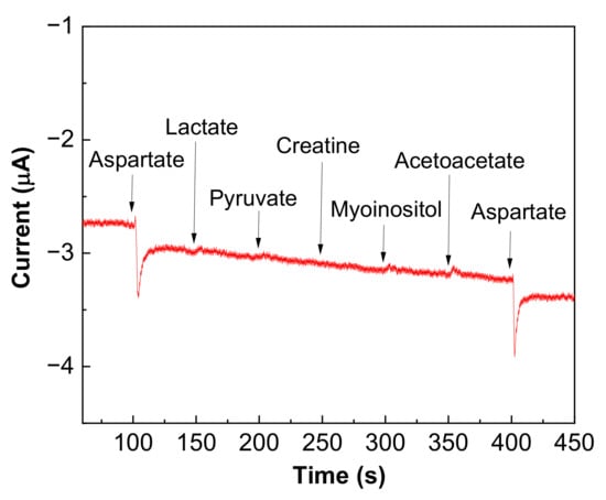 Figure 6. CA results of GluOx–ASTENs/PB/SPCE in 50 mM buffer (pH 6.0) at −0.1 V, with the additions of 0.8 mM Asp, lactate, pyruvate, creatine, myoinositol, and acetoacetate in the presence of 150 µM α-ketoglutarate.