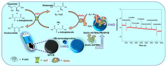 Initially, we aimed to identify the biomarkers in the spleen of olive flounder infected with S. parauberis using 1H-NMR. In 1H-NMR profiling of infected olive flounder fish, the significantly altered metabolites were glutarate, lactate, and aspartate (Asp). Recently our group reported a disposable amperometric lactate biosensor to detect lactate biomarker in fishes [19]. Furthermore, to target Asp, we designed an enzymatic biosensor for fish point-of-care applications. Firstly, the SPCE was electrodeposited with PB nanozyme (PB/SPCE). The rGO dispersed in a synthesized copolymer binder, (poly(sodium 4-styrene sulfonate-r-LAHEMA); (PSSL)), was termed P-rGO nanosheets. The P-rGO nanosheets combined with GluOx and AST enzymes were drop coated in two layers to favor electrostatic or hydrogen bonding interactions between the enzyme complexes and P-rGO nanosheets (GluOx–ASTENs). The P-rGO nanosheets not only provide a sufficient surface area for loading an appropriate number of bi-enzymes, but they also suppresses enzyme leakage, thus boosting its catalytic efficiency and enhancing the formation of a stable and selective sensing layer. The GluOx-ASTENs were co-immobilized over the nanozyme-modified biosensor and referred to as GluOx-ASTENs/PB/SPCE. A simple graphical representation of the designed aspartate biosensor is given as Scheme 1.