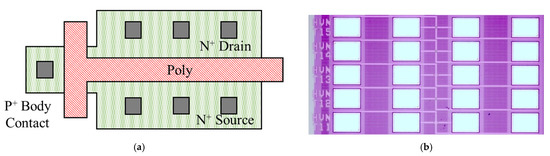All devices used in the experiments were fabricated based on the PDSOI process. The devices have a channel area of 10 μm × 1.2 μm, which is less affected by parasitic effects. Base wafers are from Shanghai Huahong Grace Semiconductor Manufacturing Corporation. The layout is shown in Figure 1. The T-gate structure is implemented with body contact to suppress the floating-body effect. The top silicon layer thickness is 100 nm, the buried oxygen layer is 145 nm thick, the gate oxide layer is 7 nm thick, and the operating voltage is 3.3 V. DIP packages are used to improve test reliability.