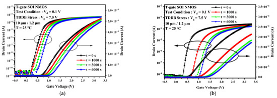 Degradation of the transfer characteristic curve of the device when the TDDB stress is applied (a) Vg = 7 V, (b) Vg = 7.5 V.