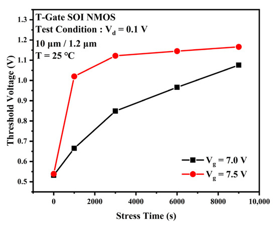 The TDDB process is generally considered to be divided into two phases. The first phase is the defect accumulation phase when a large number of traps are generated and accumulated within the gate oxide layer as the stress time increases. The second phase is the breakdown phase. When the trap density accumulated in the first phase reaches a critical value, a complete conductive path will be formed inside the gate oxide layer. At this point, the gate current will rise rapidly along with the electrical and thermal positive feedback effects, eventually leading to a breakdown of the gate oxide layer. This experiment focuses on the first phase of the TDDB process. The degradation of output characteristic curve, threshold voltage, and transconductance due to the accumulation of traps during accelerated stress were observed. Figure 2 shows the degradation of the TDDB first phase transfer characteristic curves for gate voltages Vg = 7 V (a) and Vg = 7.5 V (b) at 25 °C. There is a slight change in the device’s off-state current as the stress time increases. It can be observed that the positive shift of the curve and the subthreshold characteristics become worse. As the gate stress voltage increases to 7.5 V, the device transfer characteristic curve rapidly shifts positively for the first 1000 s as the TDDB stress time increases. The drift then decreases and tends towards saturation. The threshold voltage represents the device channel opening voltage and is closely related to the oxide layer charge and the interface charge at Si/SiO2 [13], which can reflect the change in charge inside the device. Figure 3 gives the experimental threshold voltage variation curve with increasing stress time. When the stress voltage was 7 V, the variation of the device threshold voltage with stress time was closer to a linear relationship. As the voltage stress increases to 7.0 V or 7.5 V, the threshold voltage rose rapidly for the first 1000 s and then changed slightly into saturation. Figure 4 provides the variation of the transconductance curve of the device with stress time for the same experimental conditions. It can be observed that the TDDB stress causes the transconductance curve of the sample device to drift to the right, while the transconductance maximum decreases with increasing stress time, as shown in Figure 5. At a stress magnitude of 7.5 V, the maximum transconductance value decreased by approximately 20% compared to the initial value by 1000 s and by only 6% at 6000 s compared to 1000 s.