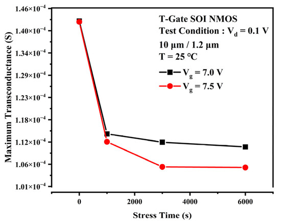 Degradation of transconductance of the device when the TDDB stress is applied: (a) Vg = 7 V, (b) Vg = 7.5 V.