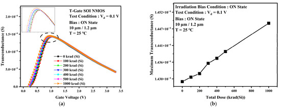 (a) Transconductance curves of devices at different irradiation doses. (b) Maximum transconductance values at different irradiation doses.