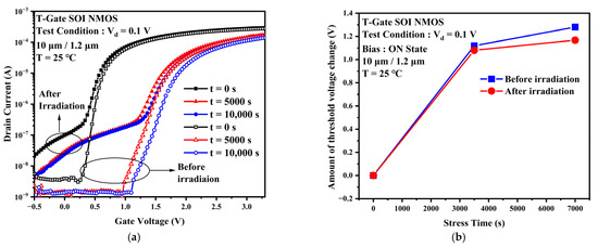 (a) Transfer characteristic curves before and after irradiation with TDDB stress applied. (b) Amount of threshold voltage changes when TDDB stress is applied before and after irradiation.