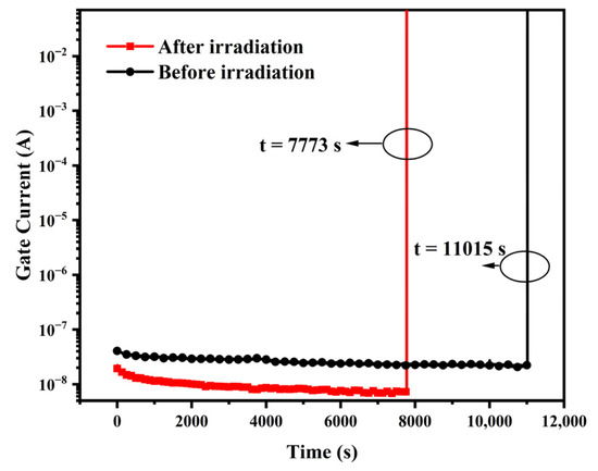 The gate current curves during the final TDDB stress test for both sets of experimental samples are given in Figure 10 and represent the average of multiple sets of experimental data. The gate dielectric breakdown occurs at t = 11,015 s for the unirradiated devices and t = 7773 s for the irradiated devices. The gate current of the unirradiated device is between 10−8 A and 10−7 A during the defect accumulation phase of the stress process, and the gate current of the irradiated device is less than 10−8 A. The experimental results show that the gate oxide TDDB lifetime of the PDSOI device is shortened after gamma irradiation compared to that of the non-gamma irradiated device. With the increase of stress time, the traps in the oxide layer gradually accumulate, which leads to the continuous increase of the anode electric field. The oxide layer is broken down when the electric field reaches a certain critical value. As the stress time increases, the trapped electrons gradually accumulate, leading to an increasing anode electric field. When the electric field reaches a critical value, the oxide layer is broken down [15,16]. The changing pattern of gate current in TDDB accelerated tests before and after irradiation is the same, indicating that the defect accumulation and breakdown mechanism under TDDB stress is not changed after being irradiated by gamma rays. After total dose irradiation, the gate oxide, BOX, and STI layers of PDSOI devices will sense positive charges. The carrier generation near the channel increases the leakage current, and the increase in the positive charge of the oxide layer leads to a higher electron leap barrier and a lower gate current. The oxide layer charge induced by irradiation accelerates the accumulation of defects under TDDB stress and reduces the gate dielectric reliability of the device.