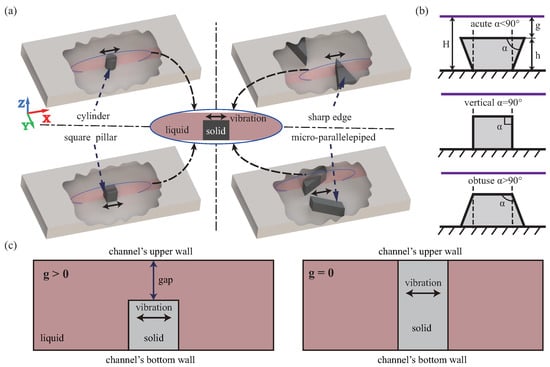 Figure 2a demonstrates the side profile diagram of the microstructure-induced streaming in the channel, which includes the microstructure’s sidewall profile and the channel’s upper wall. Among them, the microstructure sidewall profile includes the profile angle , width w, and height h. For the width w, the diameter of the micropillars has little effect on the streaming, so we ignore the effect of the w parameter and set m. For the profile angle instead of the ideal vertical angle, we select the machining error with , that is, . For the height h, set m respectively. In additional, we measure the upper wall’s position by introducing parameter g () with a range of 5 to 100 m. Meantime, we set the channel span to ignore the influence of the channel’s sidewall.