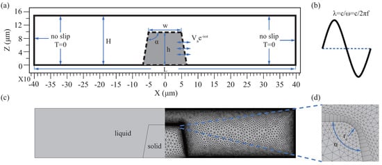 In this study, the numerical model is symmetrical, which includes both fluid and solid domains, as shown in Figure 2c. The fluid domain takes water as the reference medium, and its properties in the reference state (C, kPa) are shown in Table 1 [,], the solid domain selects SU8. SU8 photosensitive resin, as a conventional microstructure fabrication material, can be used in non-biological and biological species applications [,,]. Of course, the potential toxicity of SU8 is often a worry, but the study has evaluated SU8 biocompatibility in vivo and in vitro. It was found that the polymerized SU8 leaches very little antimony salts, which is lower than the US EPA recommendation (normal physiological conditions), and biocompatibility may be further enhanced by certain surface treatments []. The solid domain is introduced to realize fluid-solid boundary coupling, and its material properties do not affect the results. The investigation found that the vibration of the microstructure is caused by the resonance of the excited substrate []. Therefore, we assume that the microstructure is rigid, ignoring deformation. The Figure 2c shows the geometry of the numerical model discretization of side profile. To avoid singularities during the calculation, we set the round at the apex of the microstructure, as Figure 2d. The numerical model was built with the finite element software COMSOL Multiphysics, and two sets of governing equations were solved based on PT. First, the first-order acoustic field is calculated using the frequency domain thermoviscous acoustics module. Then the second-order streaming field is then calculated by applying the laminar flow module. For specific numerical schemes, refer to Appendix A.1. Table 1 lists the relevant basic and operating parameters.