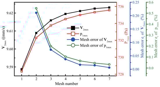 Mesh size is an important factor to ensure the accuracy of COMSOL finite element analysis. The larger the mesh size, the greater the discrete error. With the decrease in size, the calculation accuracy is ensured, but the demand for computing resources increases. Therefore, it is necessary to find a suitable size. To reduce computation, we divide meshes by region. The boundary layer mesh with the maximum size is set in the fluid region near the boundary layer. For the other fluid domain, the acoustic wave propagates at wavelength with a small velocity gradient, so we set the maximum size . We set up seven different meshes to explore the optimal size. Table A1 lists the details of the meshes whose size decreases in order.