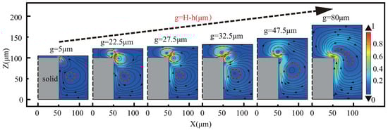 The streaming pattern consists mainly of reverse symmetrical vortexes, with the right-half shown in Figure 4. Employing local enlargement maps near microstructures, we discovers that different positions (e.g., different g) of the upper wall differ in number, position, and intensity of vortexes. Classified by the number and shape of the vortexes, the mode can be divided into five phases as the gap increases: space limitation, high-speed vortexes development, maximum action area development, high-speed vortexes fusion, and all vortexes fusion. Due to the space constraints of ∼22.5 , the range of vortex close to the upper wall surface is small, continuously expands, and another high-speed vortex also slowly expands. When ∼27.5 , the two high-speed vortexes all grow at this phase, but grow faster near the upper wall, and eventually reach equality. When ∼32.5 , the high-speed vortex near the upper wall expands, resulting in a maximum action area, refer to Figure 5b. When ∼47.5 , the high-speed vortex near the upper wall expands and another high-speed vortex shrinks, and finally forms a high-speed vortex. When ∼80 , all vortexes merge into one pair with an increase in gap, similar to top-view mode.