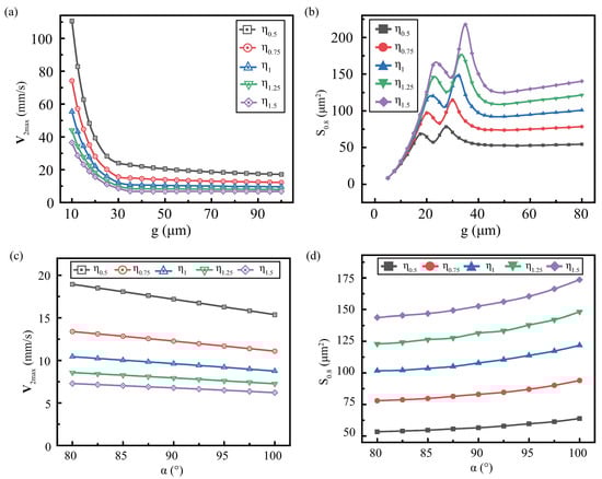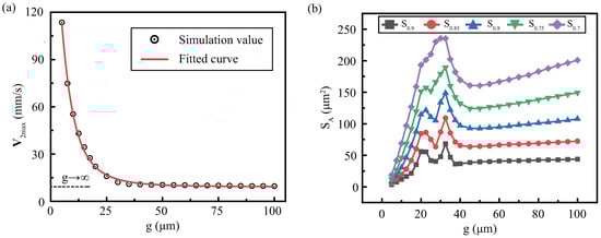 Figure 5a shows that generally decreases with g increases, showing a tendency to initially decrease rapidly and stabilize slowly. Furthermore, using the curve fitting, we found that the with increasing gap tends to be constant, as the red solid line. Subsequently, by solving the curve limitation is about 9.3 mm/s when , which is denoted as as the black dotted line.
