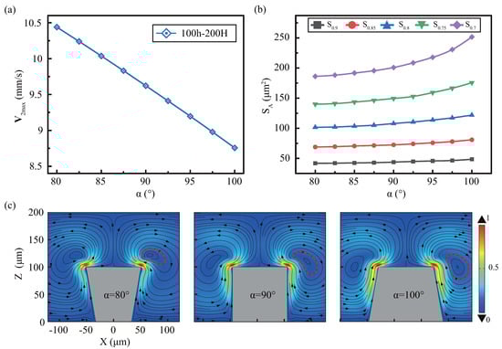 Figure 6a demonstrates that the decreases approximate linearly with increase and the effective areas are reversed. As the angle increases, different effective areas expand further, and each effective area’s stratification has less influence by the angle, show in Figure 6b. As show in Figure 6c, the sidewall angle has little impact on streaming mode. The overall performance is a pair of anti-vortex, the angle increases, the vortex intensity decreases, the area increases, and the vortex position changes slightly.