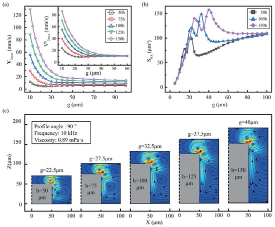 As an important factor in boundary streaming, height is worthy of attention. In this section, we investigate the effects of sidewall profile angle and upper wall gap g on streaming at various heights. We set is added, and its aspect ratio is 0.5, 0.75, 1, 1.25, 1.5, respectively. Figure 7 shows the effect of g on the streaming under various heights. As show in Figure 7a, is positively associated with h under the same g. In addition, we set height-normalized equivalent velocity , when the gap (≥50 m) is large, the under various h is approximately equal. But when the gap is small, the generated by the higher height is also larger. This indicates that if the gap is large, and small, .