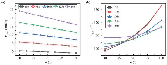 When discussing the effect of on the streaming under various h, we fixed the gap ( ). Since the mode change was small, it is not discussed in this article. And the general rules of and are similar for various height, but have small differences, as shown in Figure 8. Figure 8a shows that decreases more steeply with decreasing at higher h, which is related to the viscous boundary layer. Figure 8b shows the impact of sidewall angles for various heights on the effective area and finds that the slope of with is inversely proportional to height. This is since when , the higher height collects more dissipated energy at the tip, and its effective range is larger. When , the larger height, the more the viscous dissipation in the sidewall of microstructure, but the more dispersed the viscous dissipation region, resulting in a slower increase.