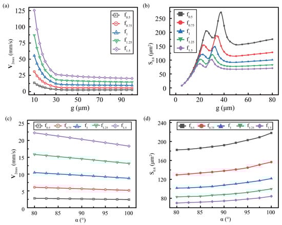 Figure 9a shows the effect of g on with various f, where , . When g is the equal, increased with increasing frequency. The equivalent velocity of frequency is introduced. It is found that the equivalent velocity from various frequencies under all gaps is approximately equal, as Appendix B.2. This indicates that is proportional to the square of the frequency, not affected by the gap. In other words, the small gap does not amplify the enhancement effect of high frequencies, which is different from height. This article adopts a fixed vibration displacement amplitude , so the velocity amplitude is proportional to the frequency f, . Thus, is also proportional to the square of [], . Substituting the above equation into the equivalent velocity of frequency, get: