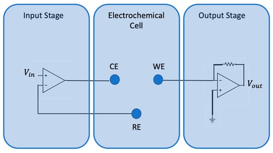 The device used for voltammetric analysis of the soil is the BIONOTE-L, developed by the Electronics and Sensory Systems Unit of the Campus Bio-Medico University of Rome [26,27]. This device is able to operate mainly in liquids, and provides a fingerprint of samples under testing. It consists of an electronic interface and an electrochemical cell. A variable voltage (triangular wave of amplitude [−1 V; +1 V] and frequency 0.01 Hz) is generated by the interface and is applied to the electrochemical cell. These voltage inputs generate redox reactions characteristic of the analyzed solution. The electrochemical cell used in voltammetry consists of three electrodes called the working electrode (WE), reference electrode (RE), and counter electrode/auxiliary electrode (CE). The circuit diagram of the device is shown in Figure 1.