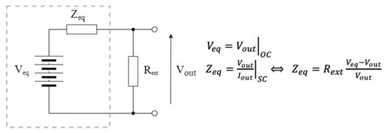 Considering a generic fuel cell, a simplified Thevenin model (whose values depend on the operating conditions of the plant) corresponds to that in Figure 2, where Vout is the voltage supplied at the output of the fuel cell. Veq is determined by measuring the open-circuit voltage generated by the system, identifying a parameterization that may depend on various factors, such as the number of electrodes used as well as their size, the type of soil, the climatic conditions, and the level of humidity; meanwhile, Zeq is determined by measuring the current delivered to a variable load and the obtained Vout voltage in different operating conditions.