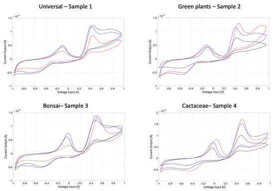 The three voltammograms (blu, red and black) registered for each of the four soils under testing: sample 1: universal; sample 2: green plants; sample 3: bonsai; sample 4: Cactaceae. The evident ‘shape’ of the voltammograms is common to all the samples because of specificities of the soil (in general); however, each of these profiles presents some peculiarities which should be specific to the soil typology. Besides, reproducibility over three samples is acceptable but of course affected by differences in a biological sample (as the soil is) due to different sites of sampling that were tested for each measurement.