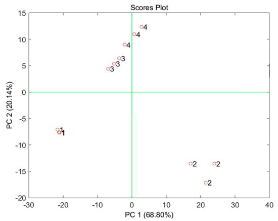 Scoreplot of the first two PCs of the PCA model built on the data reported in Figure 4. Labels: 1. universal; 2. green plants; 3. bonsai; 4. Cactacae.
