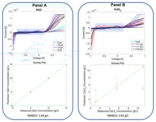 Panel A: voltammetric fingerprint registered by the BIONOTE-L in the measurement of the bonsai soil with different concentrations of NaCl (0, 5, 10, 15 g/L) added; the voltammogram is composed of 500 points. These values were used as a multidimensional data set, and were elaborated with partial least square discriminant analysis (PLS-DA), building an ad-hoc predictive model (cross-validated via the leave-one-out criterion). Its performance is described in the lower part of Panel A, reporting the predicted NaCl vs. measured NaCl concentration graph and the obtained root mean square cross-validation error (RMSECV): 1.64 g/L. Panel B: voltammetric fingerprint registered by the BIONOTE-L in the measurement of the bonsai soil with different concentrations of CaCl2 (0, 1.11, 5.55, 11.1 g/L) added; the voltammogram is composed of 500 points. These values were used as a multidimensional data set, and were elaborated with PLS-DA, building an ad-hoc predictive model (cross-validated via the leave-one-out criterion). Its performance is described in the lower part of Panel B, reporting the predicted CaCl2 vs. measured CaCl2 concentration graph and the obtained RMSECV: 2.87 g/L.
