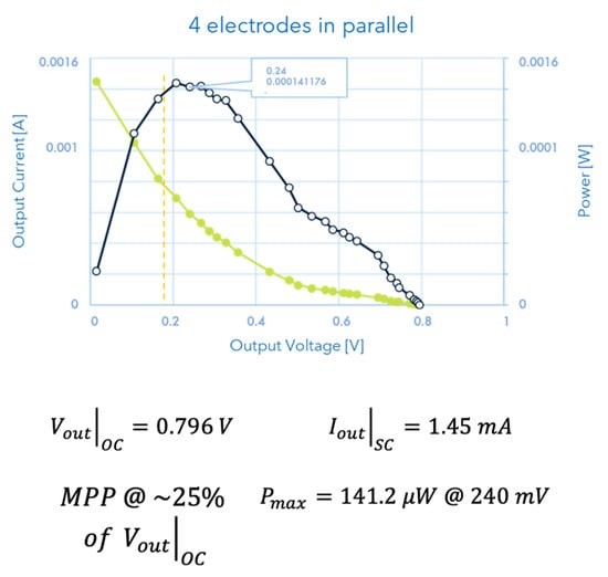 The current vs. voltage (green curve) as well as the power vs. voltage (black curve) data are reported in the graph. It is important to point out three characteristic points which show the non-neglectable values of the measured electrical quantities, both in terms of soil–plant characterization (which is the subject of the paper) and energy produced for successive harvesting or utilization: the MPP @ ; the Vout of Open Circuit; the Iout of Short Circuit, whose values are put in evidence in the figure.