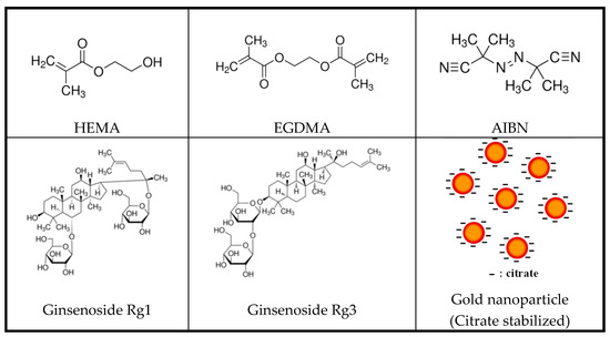 Interventionary studies involving animals or humans and other studies that require ethical approval must list the authority that provided approval and the corresponding ethical approval code. In this study, 2-hydroxyethylmethacrylate (HEMA, Sigma-Aldrich, St. Louis, MO, USA), one of the main materials of the hydrogel lens; ethylene glycol dimethacrylate (EGDMA, Sigma-Aldrich, St. Louis, MO, USA), a crosslinking agent; and azobisisobutyronitrile (AIBN, Sigma-Aldrich, St. Louis, MO, USA), a thermal initiator, were copolymerized. In addition, two types of natural ginsenosides, Rg1 and Rg3 (Sigma-Aldrich, Ruelzheim, Germany), were used. In addition, gold nanoparticles were used as additives, and sphere-shaped gold nanoparticles and rod-shaped nanoparticles with an aspect ratio of 3 times or more were selected. The nanoparticles were purchased from Fine Nano Co., Ltd. (253, Samseong-ro, Yeongtong-gu, Suwon-si, Gyeonggi-do, Seoul, South Korea). For all other reagents, Sigma-Aldrich products were used. The structural formulas of the materials used in the experiment are presented in Figure 1.