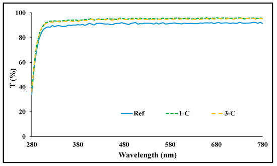 Spectral transmittances of samples (Ref, 1-C, 3-C).
