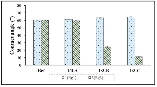 Contact angles of samples (Ref, 1/3-A, 1/3-B, 1,3-C).