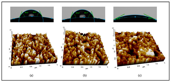 Contact angles and AFM images of samples ((a) Ref, (b) 1-C, (c) 3-C).