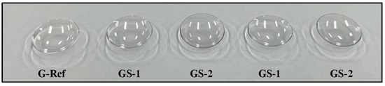 A basic combination was formed using HEMA, EGDMA, and AIBN, and the ginsenosides Rg1 and Rg3 were added at a ratio of 0.1% to 2%, respectively, to prepare a hydrogel contact lens. In addition, a new basic combination was formed by selecting the type of ginsenoside and various ratios, and then, gold nanoparticles were added at a ratio of 0.1% and 0.2%, respectively, to prepare hydrogel lens. In addition, the sample containing the gold nanoparticles was uniformly dispersed for about 1 h using an ultrasonic disperser (Branson 2510, Branson, Mexico) for dispersion, and each monomer was stirred using a vortex. All contact lenses were thermally polymerized at 100 °C for 1 h using a cast molding method. The samples prepared by the basic combination were named Ref and were named 1-A, 1-B, and 1-C and 3-A, 3-B, and 3-C, according to the type and amount of ginsenoside added. In addition, 3-C was named G-Ref and named GS-1, GS-2, GR-1, and GR-2 according to the type and amount of gold nanoparticles added to improve functionality. The mixing ratios of the prepared lenses are presented in Table 1.